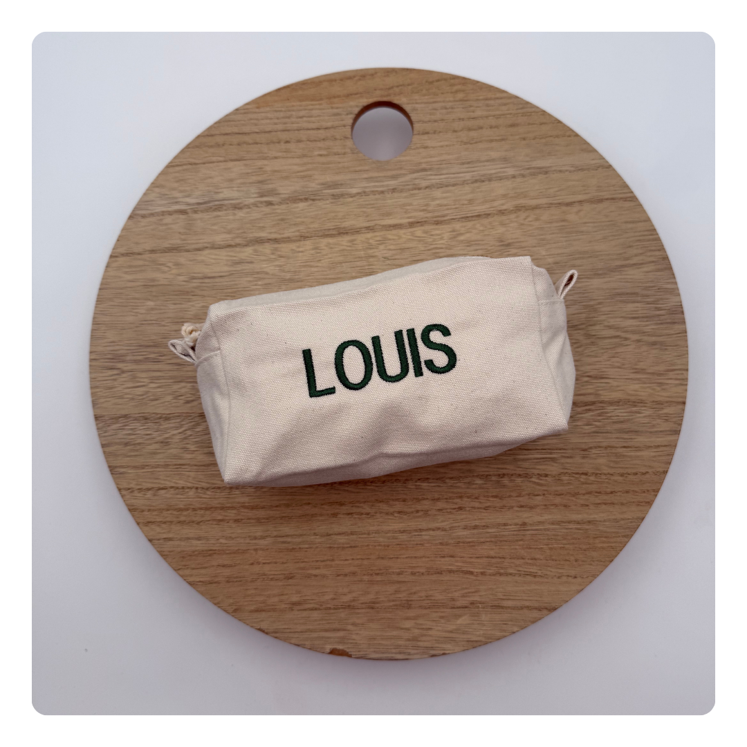 Een pennenzak in natuurlijke katoenlook, geborduurd met een naam.