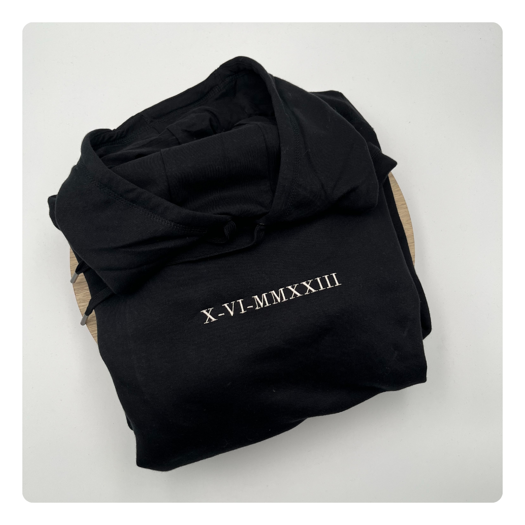 Laat jouw hoodie borduren met een tekst, datum, lijntekening of opgevulde afbeelding.