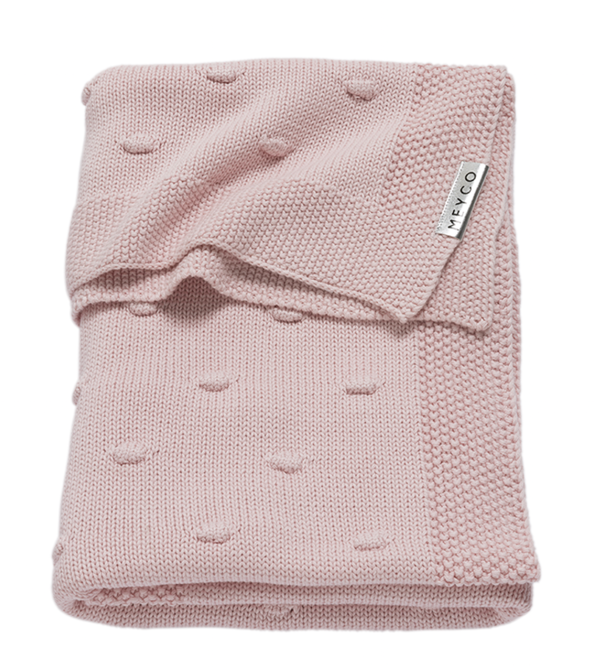 Een zacht, gebreid dekentje met subtiele knoopstructuur ideaal voor in de wieg, het ledikant of gewoon om onder te kruipen op de bank.